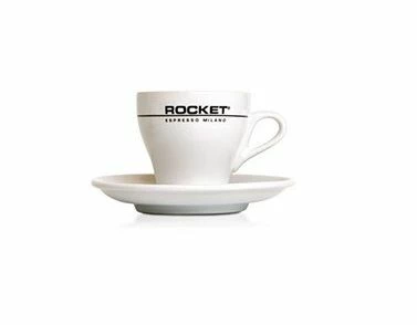 Schöne klare Flat White Tasse von der Firma Rocket, an der Seite ist das Logo von Rocket zu sehen. Die Tasse kommt mit Untertasse.